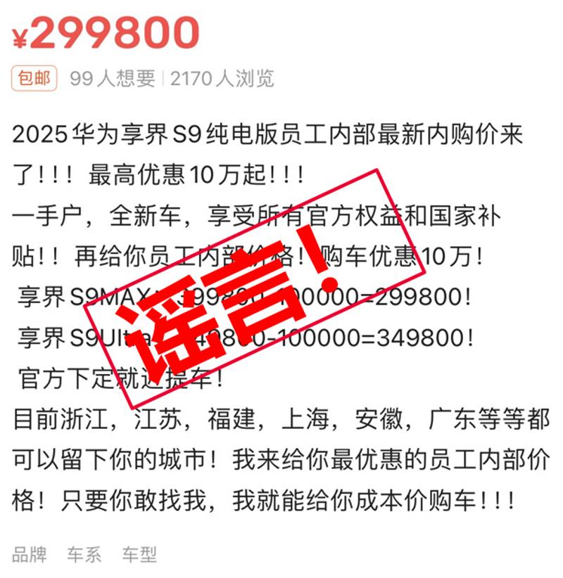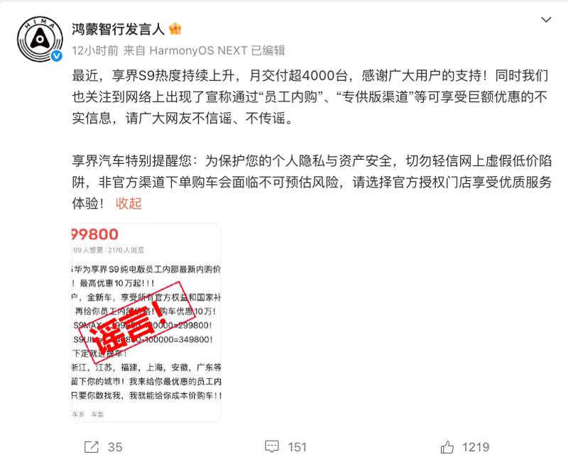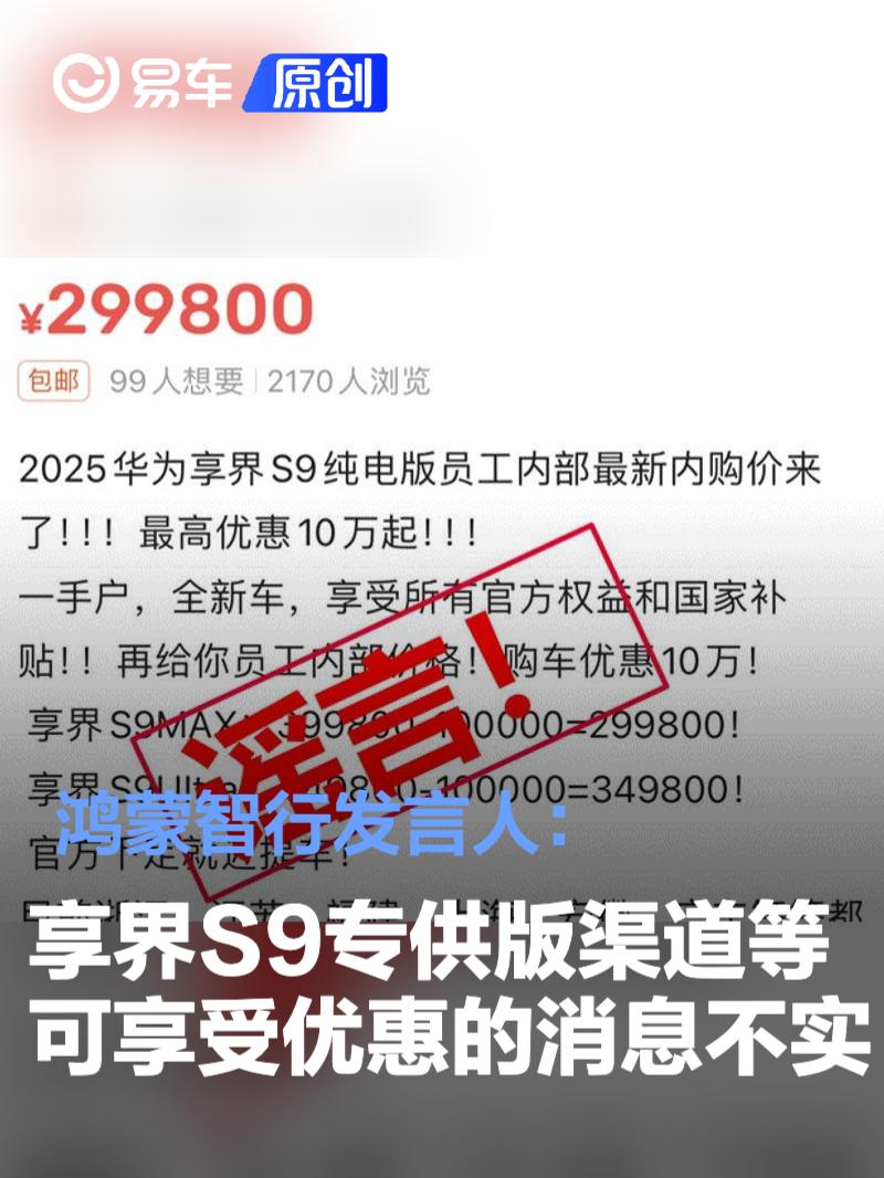 易车讯 日前,鸿蒙智行发言人针对网络上出现享界S9可通过“员工内购”、“专供版渠道”等可享受巨额优惠的信息进行了回应。鸿蒙智行发言人表示,该消息为不实信息,请广大网友不信谣、不传谣。