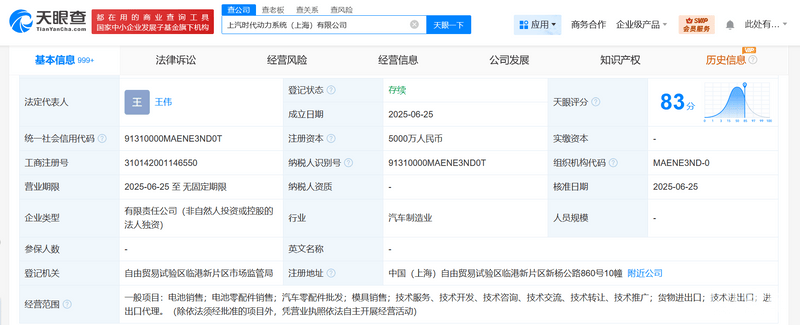 易车讯 天眼查App显示,近日,上汽时代动力系统(上海)有限公司成立,法定代表人为王伟,注册资本5000万人民币,经营范围为电池销售,电池零配件销售,汽车零配件批发,模具销售,技术服务、技术开发、技术咨询、技术交流、技术转让、技术推广,货物进出口,技术进出口,进出口代理。