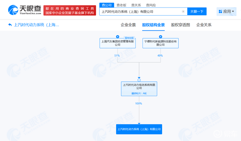 股权全景穿透图显示,该公司由上汽时代动力电池系统有限公司全资持股,后者由上汽集团(600104)旗下上海汽车集团投资管理有限公司、宁德时代(300750)共同持股。