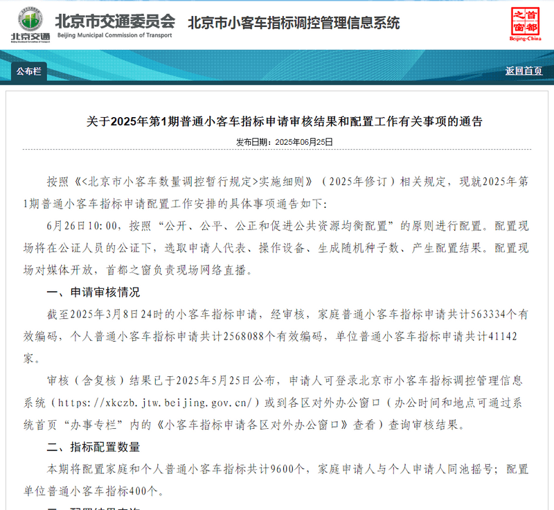 易车讯 6月25日,北京交通发布关于2025年第1期普通小客车指标申请审核结果和配置工作有关事项的通告,明天10时将配置9600个普通小客车指标,超56万家庭申请。
