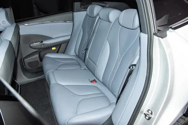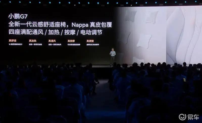 小鹏G7配备了载全新一代云感舒适座椅,采用Nappa真皮包覆,并拥有四座满配通风、加热、按摩以及电动调节功能。
