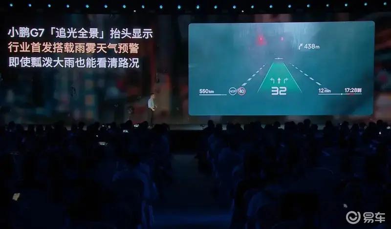 小鹏G7还首搭与华为合作打造的“追光全景”抬头显示系统,该系统具备全场景AR车道级导航能力,显示画幅达到87英寸,分辨率为1920×1080,通过HUD画面可以显示车辆续航信息、驾驶辅助开启状态、限速、行车线、车速、导航等相关信息。该系统具有100毫秒低延时、12000尼特亮度、1800:1对比度,还带有AR防抖、坡度补偿、时延补偿、畸变矫正算法等。