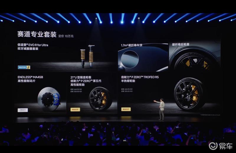 SU7 Ultra纽北限量版搭载价值10万元的赛道专业套装,包含倍适登EVO R for Ultra绞牙减振器套装、1.7平米碳纤维车顶、碳纤维后轮眉、倍耐力P ZEROTM TROFEO RS半热熔轮胎、ENDLESS MA45B高性能制动片、21"U型锻造轮毂、倍耐力P ZERO第五代高性能轮胎、碳纤维双风道前舱盖、碳纤维固定式大尾翼、碳纤维空气动力学底护板(可增加44kg下压力)、高性能版碳纤维赛车桶椅以及钢制防滚架(半幅)。