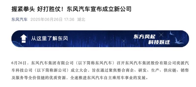 面对汽车行业电动化、智能化转型的浪潮,东风汽车始终求新求变、敢做善为,主动响应瞬息万变的市场形势,明确市场主体,集聚品牌资源,以更加积极主动的态度,迎接市场挑战。成立新公司,是东风汽车在自主乘用车领域再次“握紧拳头”,为“打赢胜仗”提供资源保障,推动自主乘用车事业进一步发展的重要举措。