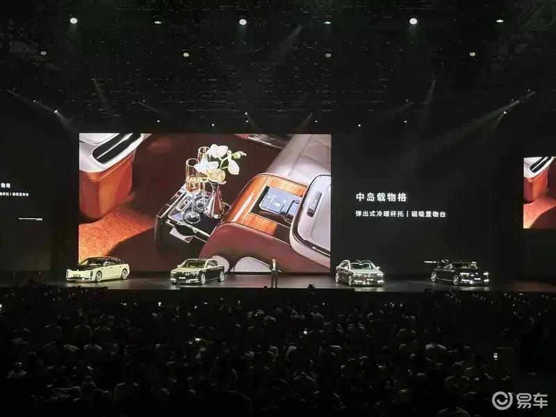 后排座椅中间采用多功能超奢华中岛台设计,集成高端铝合金小桌板、冷暖杯托、无线充电区、压缩机冰箱、一键静音、一键全黑、指纹密码箱等。小桌板拥有多种折叠形态,还集成化妆镜等。冷暖杯托能随时满足后排乘客对饮品不同温度需求。指纹密码箱位于后排座椅前中央扶手后侧下方,可通过后排中岛台指纹模块解锁。