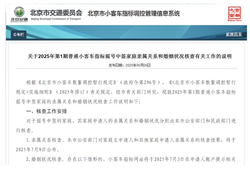 易车讯 6月26日,北京市交通委在公众号发布《关于2025年第1期普通小客车指标摇号中签家庭亲属关系和婚姻状况核查有关工作的说明》。