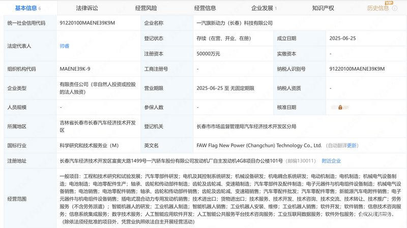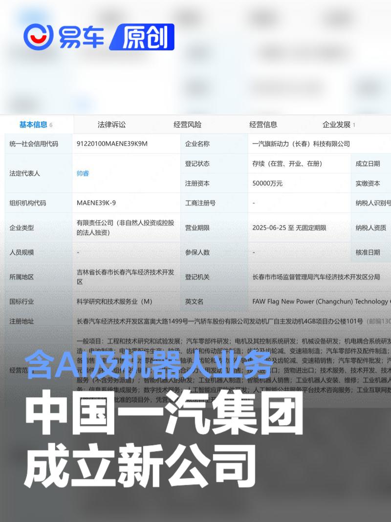 易车讯 近日,据企查查数据显示,一汽旗新动力 (长春) 科技有限公司成立,注册资本5亿元,由中国一汽集团间接全资持股。公司经营范围涉及智能机器人研发销售、人工智能应用软件开发等前沿科技领域,是一汽在智能领域的重要布局。