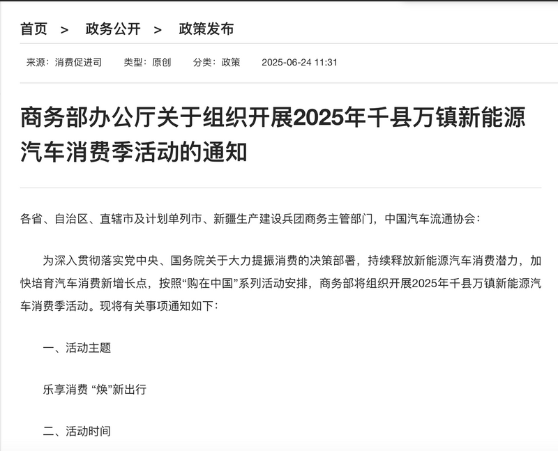 易车讯 商务部办公厅发布组织开展2025年千县万镇新能源汽车消费季活动的通知。通知指出,各地要广泛动员社会力量参与新能源汽车消费季活动,支持独立第三方二手车信息查询平台提升运营质效,加强新能源在用车检测平台推广应用,扩大新能源二手车交易。