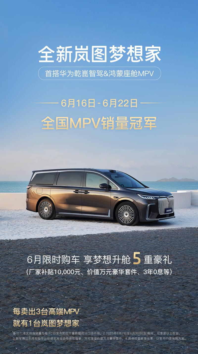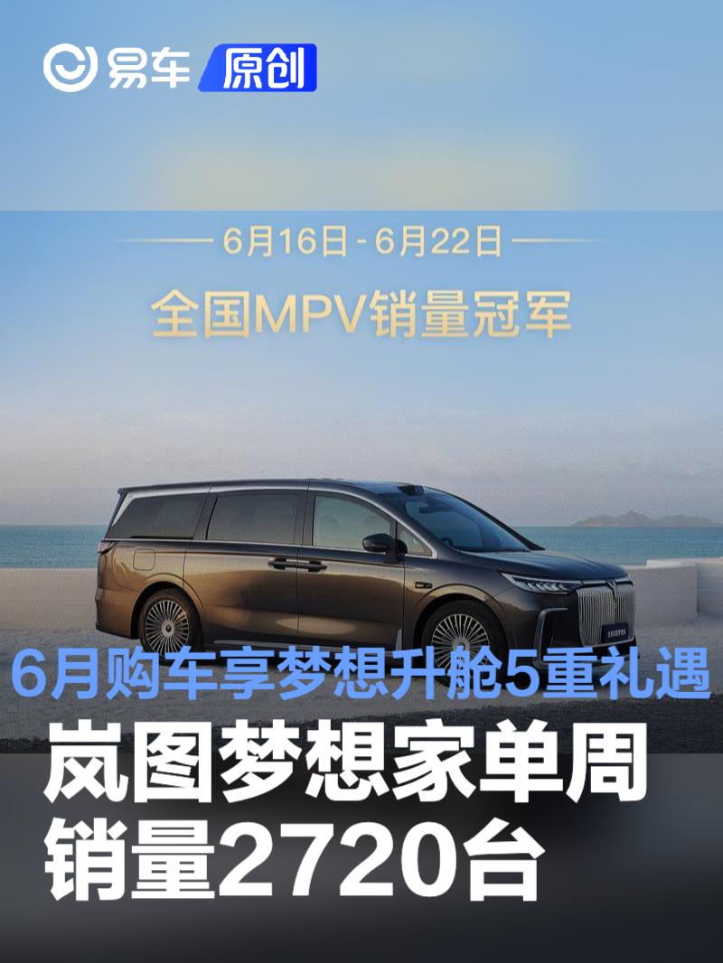 易车讯 6月第三周(6月16日-22日)MPV周销量显示,岚图梦想家单周销量2720台再夺MPV销量冠军。