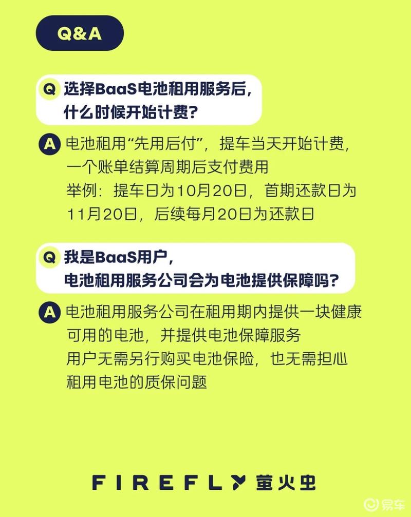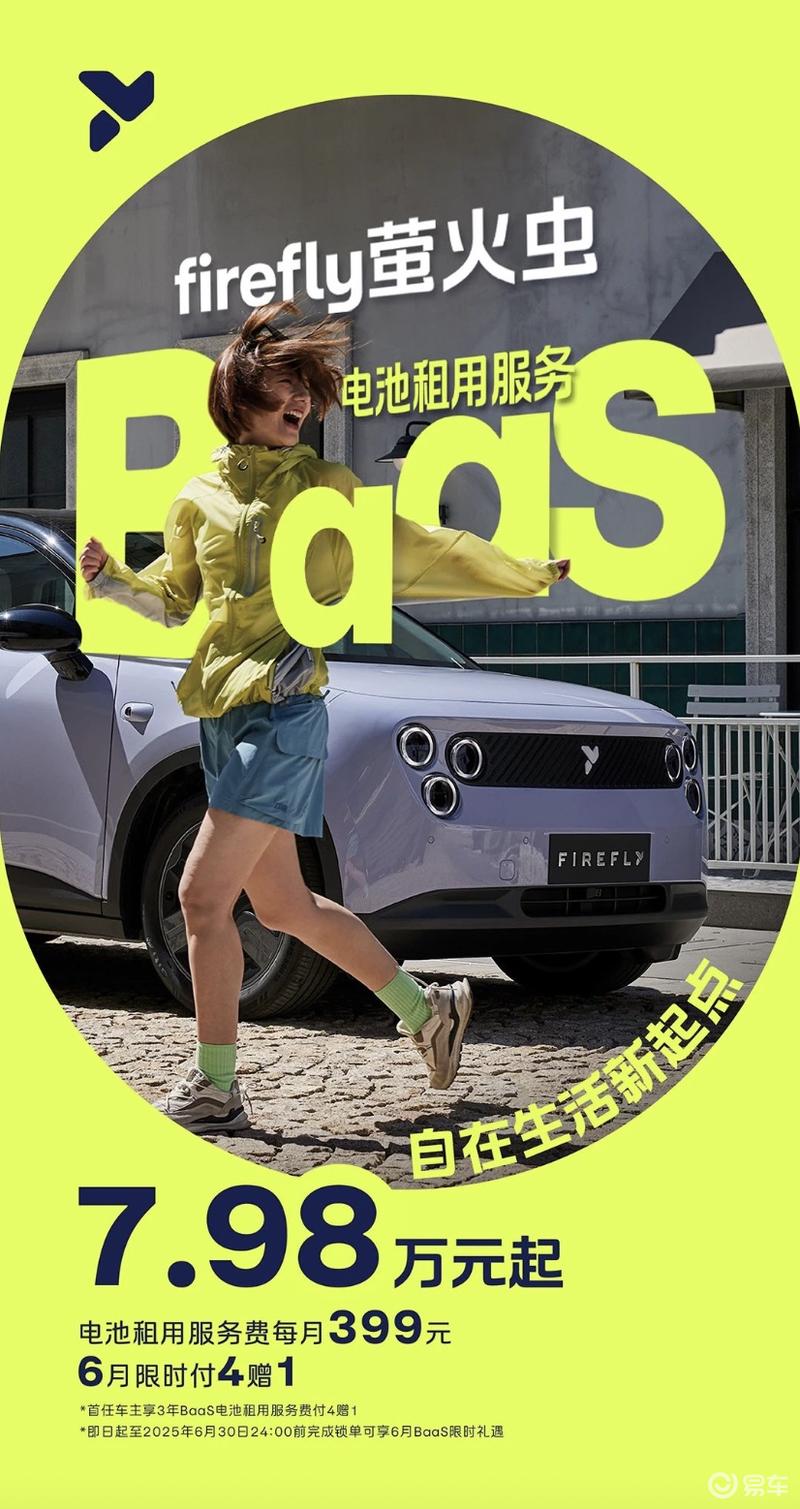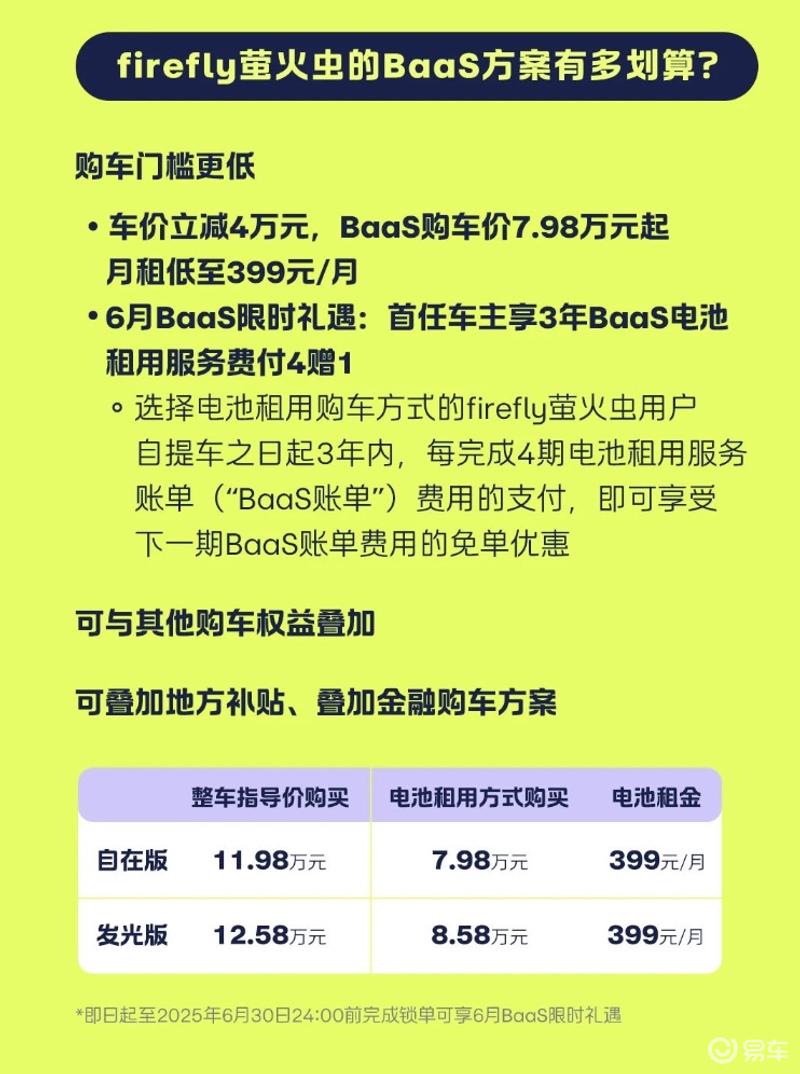 6月BaaS限时礼遇:首任车主享3年BaaS电池租用服务费付4赠1:选择电池租用购车方式的firefly萤火虫用户自提车之日起3年内,每完成4期电池租用服务账单("BaaS账单")费用的支付,即可享受下一期BaaS账单费用的免单优惠。
