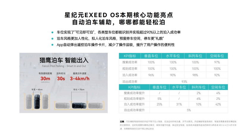 在泊车辅助方面,新版本实现了车位“可见即可泊”,各类型车位都能识别并实现超过90%以上的泊入成功率。同时,泊车风格更加人性化,车辆能够为旁车预留空间。而App也能够自动弹出遥控泊车操作卡片,减少了操作层级,提升了操作的便利性。