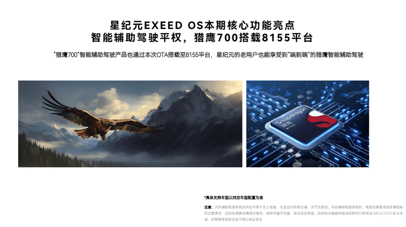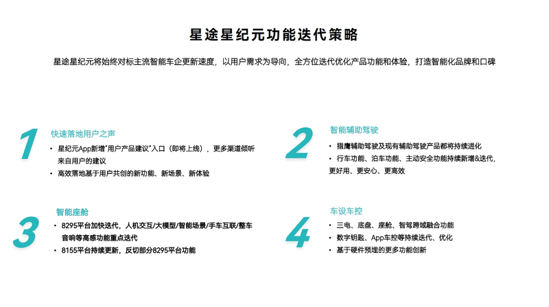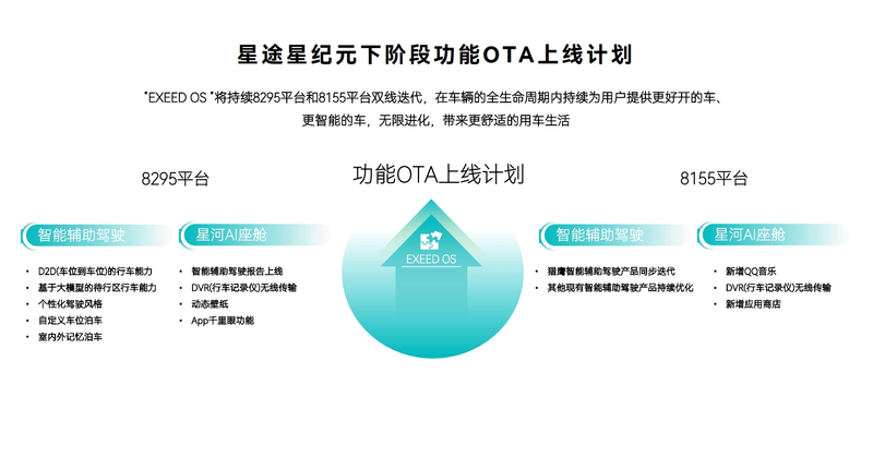未来,星途星纪元功能迭代策略将始终对标主流智能车企更新速度,以用户需求为导向,优化产品功能和体验。另外,EXEED OS将持续8295平台和8155平台双线迭代,在车辆的全生命周期内持续为用户提供更好用、更智能的用车体验。