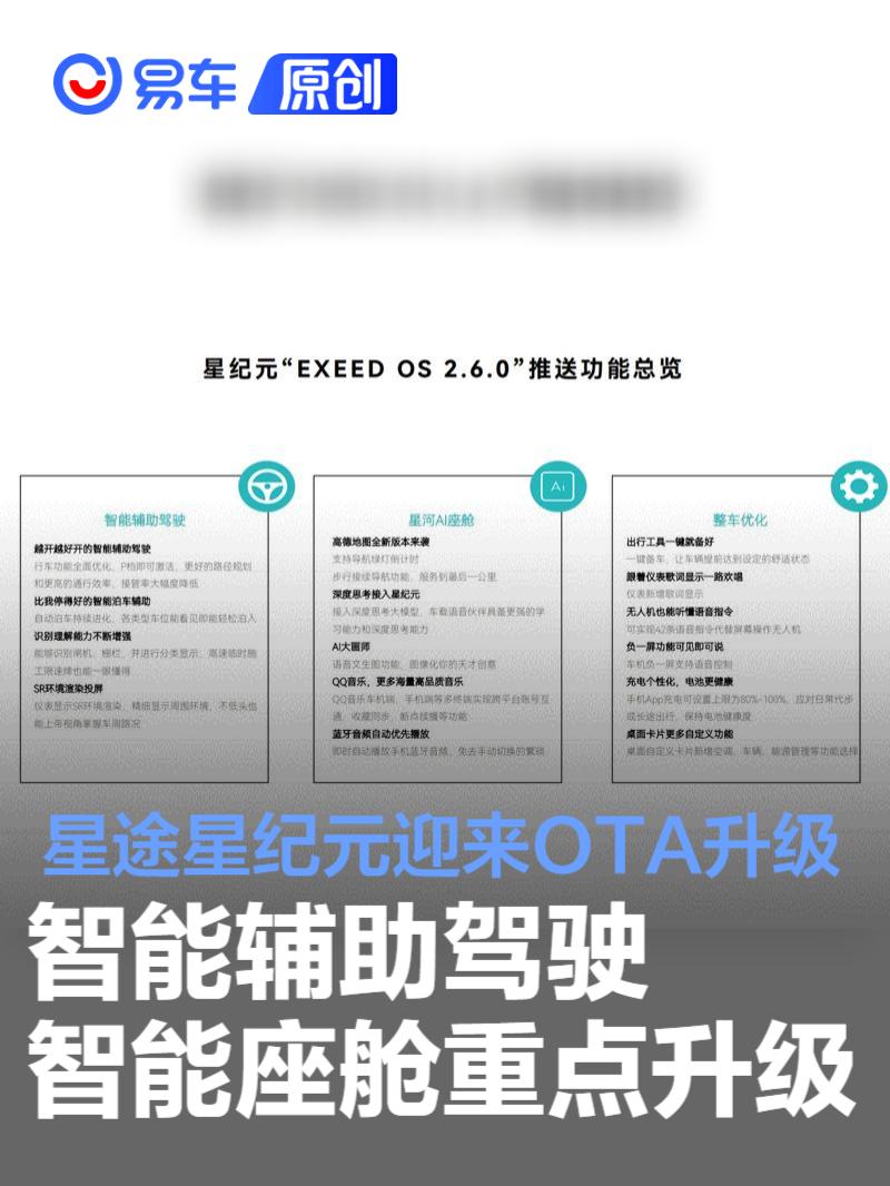 易车讯 6月23日,星途星纪元EXEED OS 2.6.0和1.6.0迎来重要更新升级,新版本系统在智能辅助驾驶、智能座舱以及便捷车控方面进行了全面升级。
