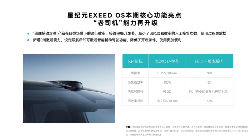 首先在智能辅助驾驶领域,猎鹰辅助驾驶在各类场景下的通行效率、接管率提升显著,减少了因风险和效率的人工接管次数。新版本新增P挡激活能力,设定导航后即可激活智能辅助驾驶功能,降低了开启条件,使用更加便利。