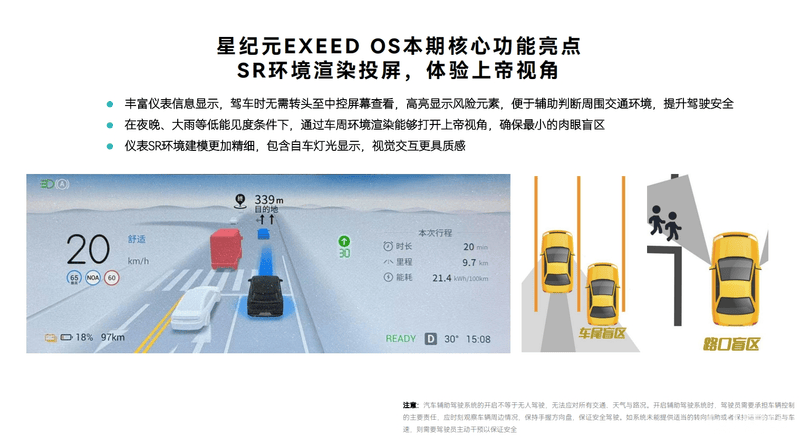 在仪表盘的智能驾驶辅助SR画面上,星途星纪元仪表显示信息更为丰富,驾车时无需转头至中控屏幕查看,画面中会高亮显示风险元素,便于辅助判断周围交通环境,提升驾驶安全。在夜晚、大雨等低能见度条件下,通过车周环境渲染能够打开上帝视角,确保最小的肉眼盲区。仪表SR环境建模也更加精细,包含自车灯光显示,视觉交互更具质感。