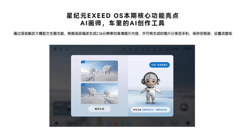 另外,EXEED OS还升级了AI画师功能,车机系统能够通过语音触发大模型文生图功能,根据语音描述生成2.5k分辨率的高清图片内容,并可将生成的图片分享至手机、保存至相册、设置成壁纸。