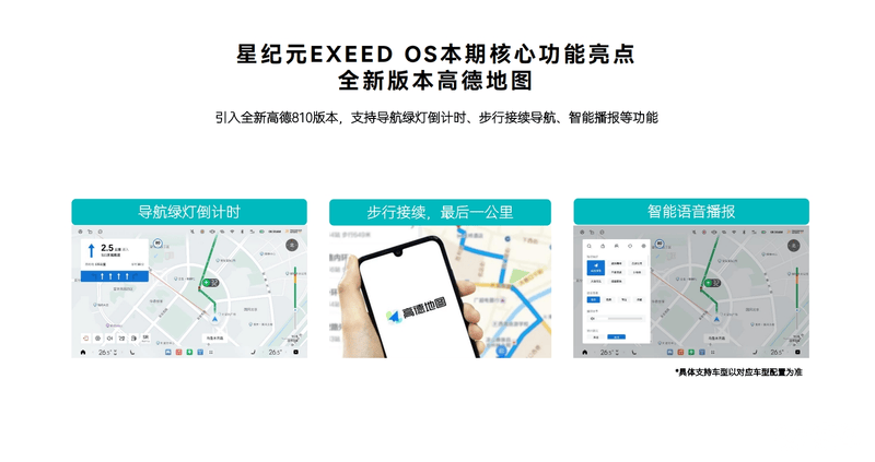 在智能座舱方面,本次星纪元发布EXEED OS升级了全新高德地图810版本,能够支持导航绿灯倒计时、步行接续导航、智能播报等功能。