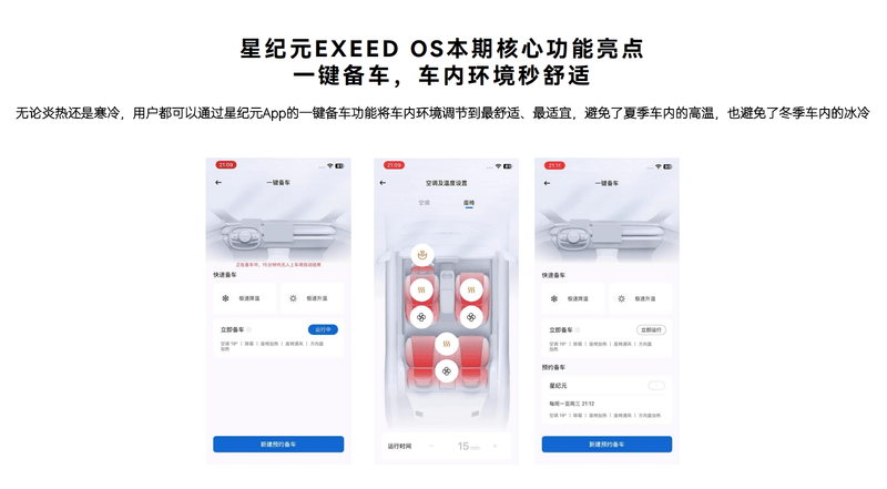在炎热和寒冷天气下,车主都可以通过星纪元App的一键备车功能将车内环境调节到最舒适、最适宜,避免了夏季车内的高温,也避免了冬季车内的冰冷。