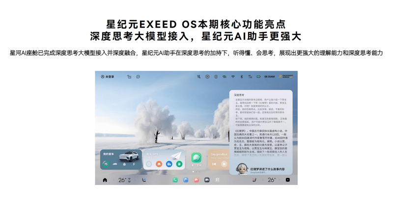 在AI领域,EXEED OS的星河AI座舱已完成深度思考大模型接入并深度融合,星纪元AI助手在深度思考的加持下,听得懂、会思考,展现出更强大的理解能力和深度思考能力。