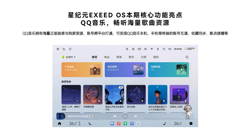 车机系统中的QQ音乐也迎来了重磅升级,QQ音乐拥有海量正版曲库与独家资源,账号跨平台打通,可实现QQ音乐车机、手机等终端的账号互通、收藏同步、断点续播等。