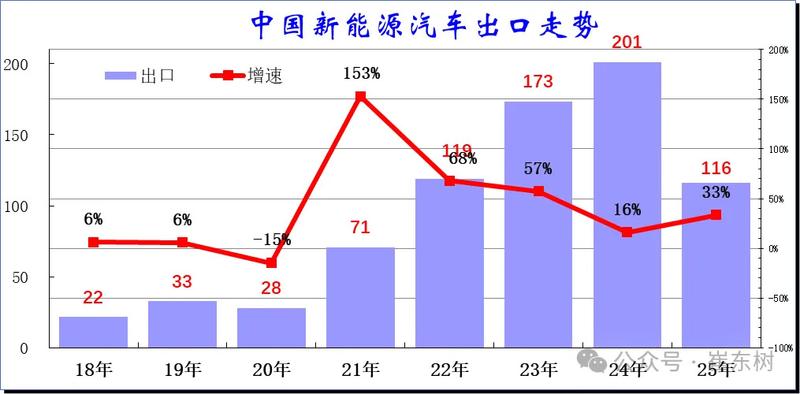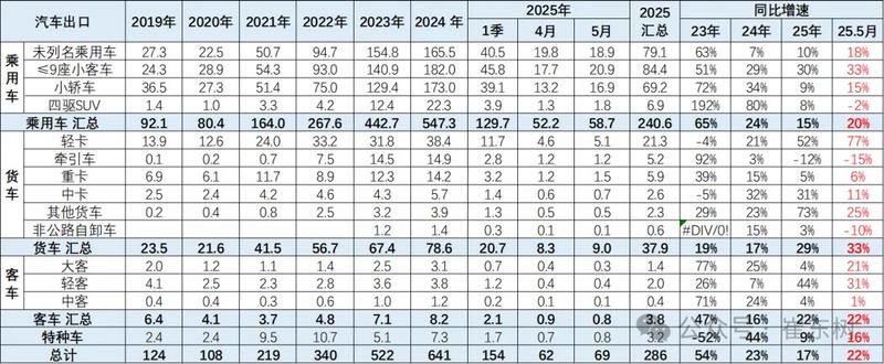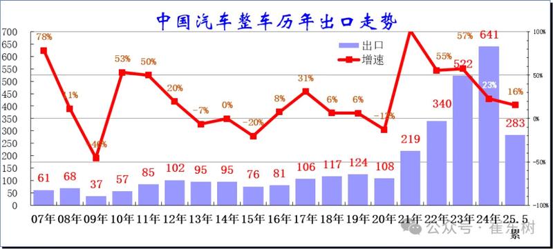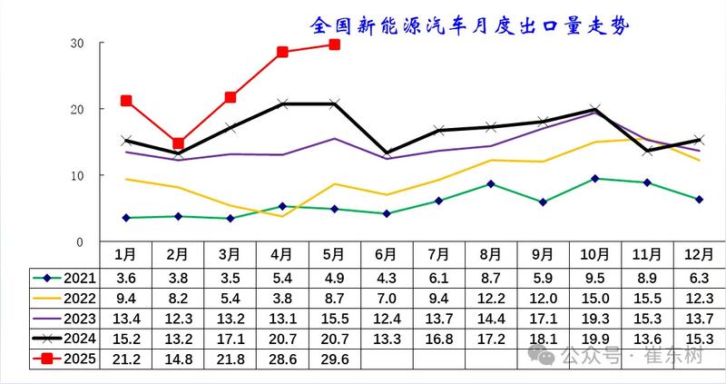 从2024年6月后,新能源出口走势低迷,市场压力较大,11月出现异常负增长局面。今年1月新能源车出口暴增的走势超强,3-5月新能源出口创历史新高,奠定了2025年的持续增长基础。