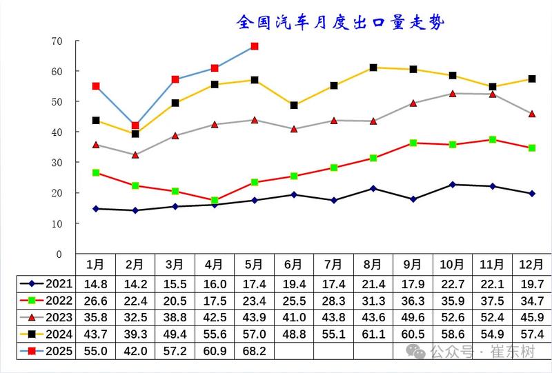 易车讯 今日,乘联分会崔东树发文称:2025年1-5月中国汽车实现出口283万辆,同比2024年1-5月增速16%,5月中国汽车实现出口68.2万辆,同比增20%,环比增12%,同、环比走势总体较强;今年的主要动力仍是中国产品竞争力提升和全球南方国家市场的小幅增长。