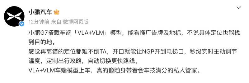 易车讯 6月23日,小鹏汽车公布小鹏G7搭载车端“VLA+VLM”模型,能看懂广告牌及地标,不说具体定位也能找到目的地。