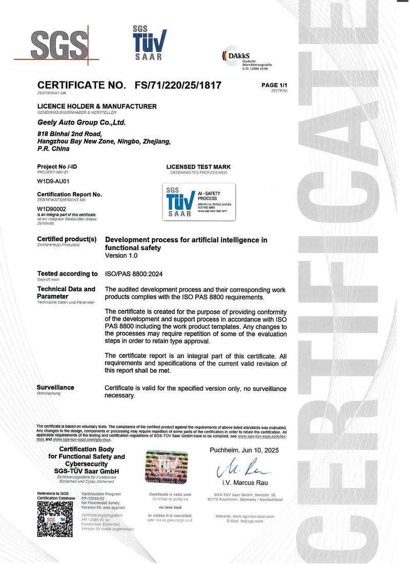 据介绍,ISO/PAS 8800是国际标准化组织(ISO)于2024年12月发布的全球首个针对道路车辆领域的人工智能安全的权威标准。吉利汽车凭借全球领先的全域安全体系,顺利通过欧盟SGS审核,获得欧洲DAkkS的权威认证。