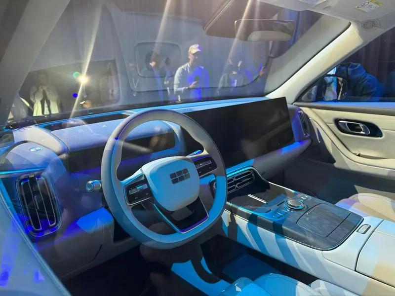 内饰方面,由液晶仪表盘和双联屏组成,整体视觉效果极具张力。新车内饰与领克900类似,配备中控屏的尺寸为30英寸,6k分辨率。从细节来看,这块儿屏幕并不是拼接的,而是一整块连屏。