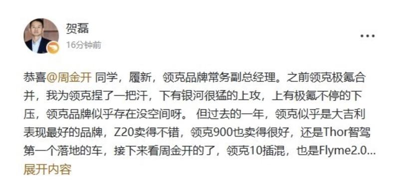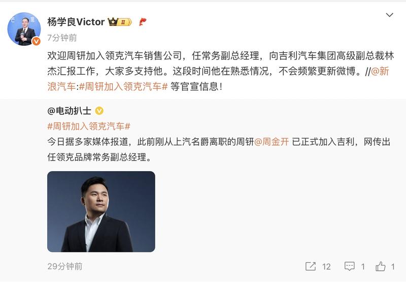易车讯 6月20日,浙江吉利控股集团高级副总裁杨学良在社交媒体上宣布,欢迎周钘加入领克汽车销售公司,任常务副总经理,向吉利汽车集团高级副总裁林杰汇报工作,大家多支持他。这段时间他在熟悉情况,不会频繁更新微博。