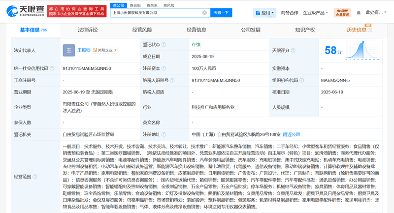 新成立的上海小米景驭科技有限公司,法定代表人为王振锁,注册资本为100万人民币。从其经营范围来看,涵盖多个领域,业务布局广泛。其中不仅有新能源汽车整车销售、汽车销售等传统汽车业务范畴,还涉足二手车经纪领域,展现出在汽车流通环节全链条发展的意图。小微型客车租赁经营服务的加入,进一步丰富了出行服务生态。