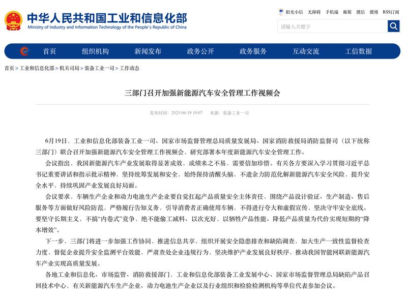 易车讯 日前,工业和信息化部装备工业一司、国家市场监督管理总局质量发展局、国家消防救援局消防监督司(以下统称三部门)联合召开加强新能源汽车安全管理工作视频会,研究部署本年度新能源汽车安全管理工作。