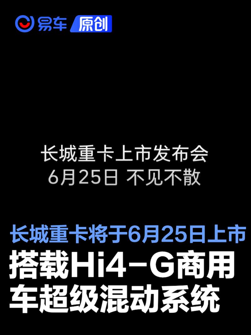 易车讯 6月19日,长城汽车董事长魏建军在社交媒体上发布了一则体验长城重卡的视频,在视频的结尾官方宣布长城重卡将于6月25日正式上市。长城重卡曾在3月26日举办的长城商用车召开技术发布会上亮相,搭载长城Hi4-G商用车超级智能混动系统。
