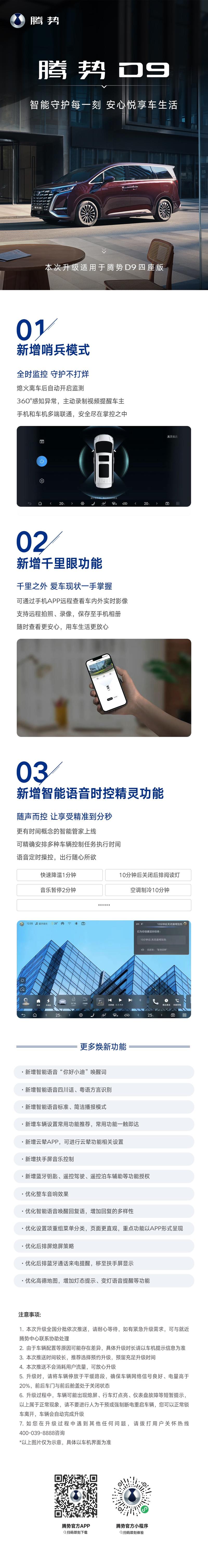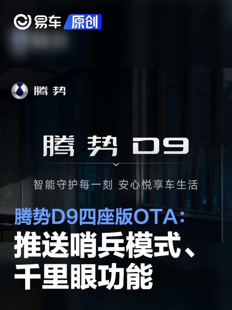 易车讯 6月19日,腾势汽车官方宣布,腾势D9四座版开启OTA升级,包括哨兵模式、千里眼功能重磅推送。