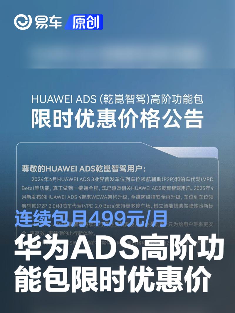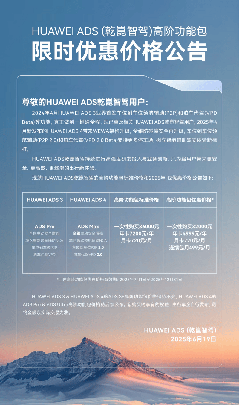 易车讯 6月19日,华为公布ADS(乾崑智驾)高阶功能包限时优惠价格,优惠价格的有效期为2025年7月1日至12月31日。根据公告,华为ADS 3和ADS 4的高阶功能包将提供不同的购买选项,ADS Pro与ADS Max分别提供一次性购买、年卡、月卡以及连续包月选项。