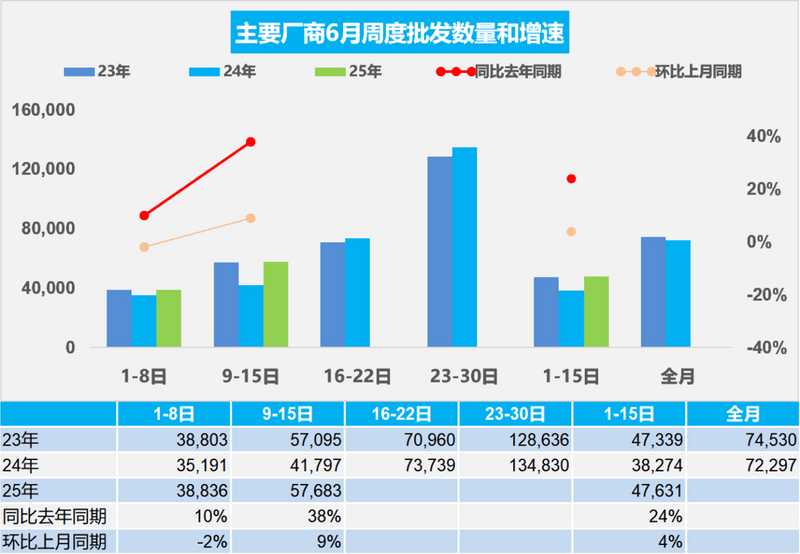 6月1-15日,全国乘用车厂商批发71.4万辆,同比去年6月同期增长24%,较上月同期增长4%。今年以来累计批发1,150.4万辆,同比增长12%。