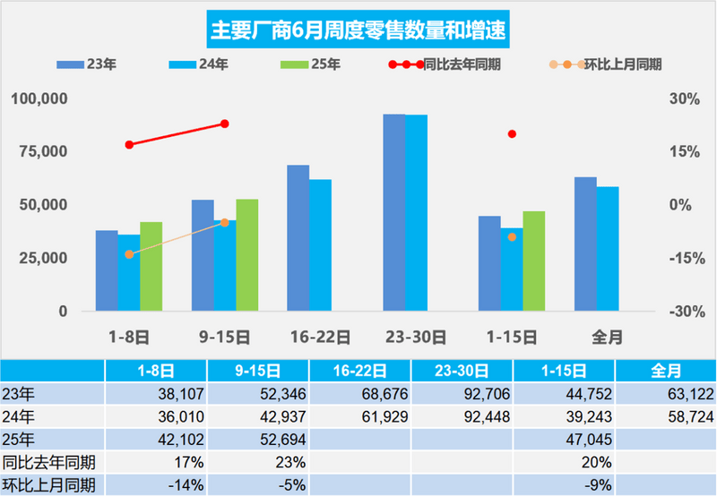6月1-15日,全国乘用车市场零售70.6万辆,同比去年6月同期增长20%,较上月同期下降9%。今年以来累计零售952.2万辆,同比增长10%。