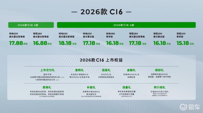 易车讯 6月18日,2026款零跑C16正式上市,售价区间15.18-18.18万元,新车上市即交付。新车拥有超70项重磅升级,竞争力显著提升。巧合的是,零跑汽车今天刚刚迎来累计交付量突破80万台的里程碑时刻,新款零跑C16的上市将进一步助推品牌销量更上一层楼。