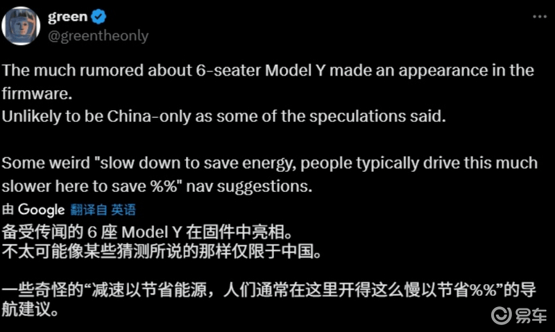 特斯拉黑客greentheonly通过分析固件信息发现,这款六座版车型不仅可能面向中国市场,还计划在全球其他市场推出。