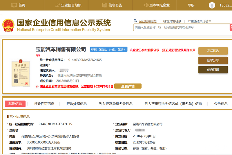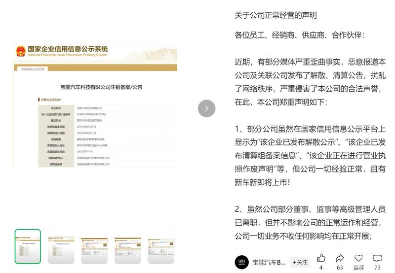 易车讯 6月17日,宝能汽车在公众号发布了关于公司正常经营的声明。宝能汽车在声明中表示,近期,有部分媒体严重歪曲事实,恶意报道本公司及关联公司发布了解散、清算公告,扰乱了网络秩序,严重侵害了本公司的合法声誉。宝能汽车强调,部分公司虽然在国家信用信息公示平台上显示为“该企业已发布解散公示”、“该企业已发布清算组备案信息”、“该企业正在进行营业执照作废声明”等,但公司一切经验正常,且有新车新即将上市。