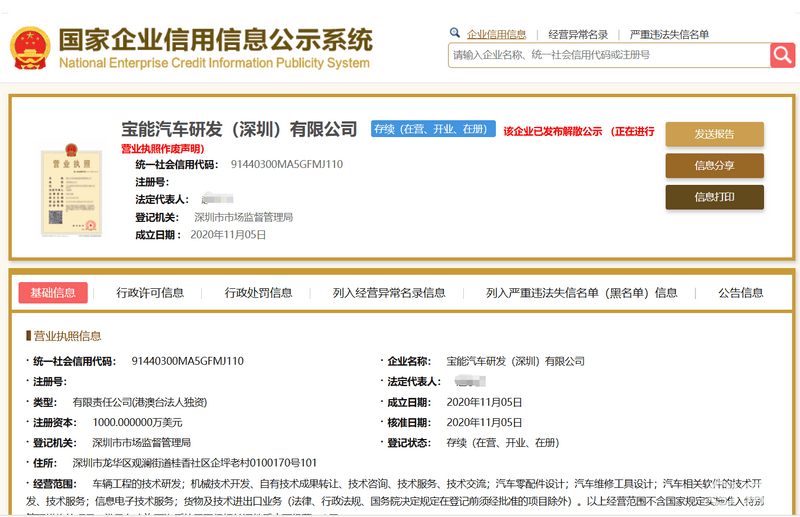 1、部分公司虽然在国家信用信息公示平台上显示为“该企业已发布解散公示”、“该企业已发布清算组备案信息”、“该企业正在进行营业执照作废声明”等,但公司一切经验正常,且有新车新即将上市!