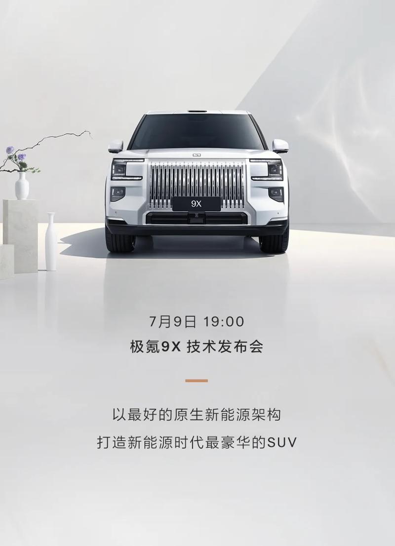 易车讯 6月17日,极氪官方公布了极氪9X全新车色极昼白官图,并表示将于7月9日举办技术发布会。新车首发搭载极氪超级电混技术,将于今年第三季度正式上市。
