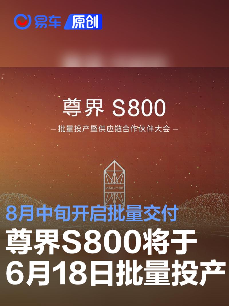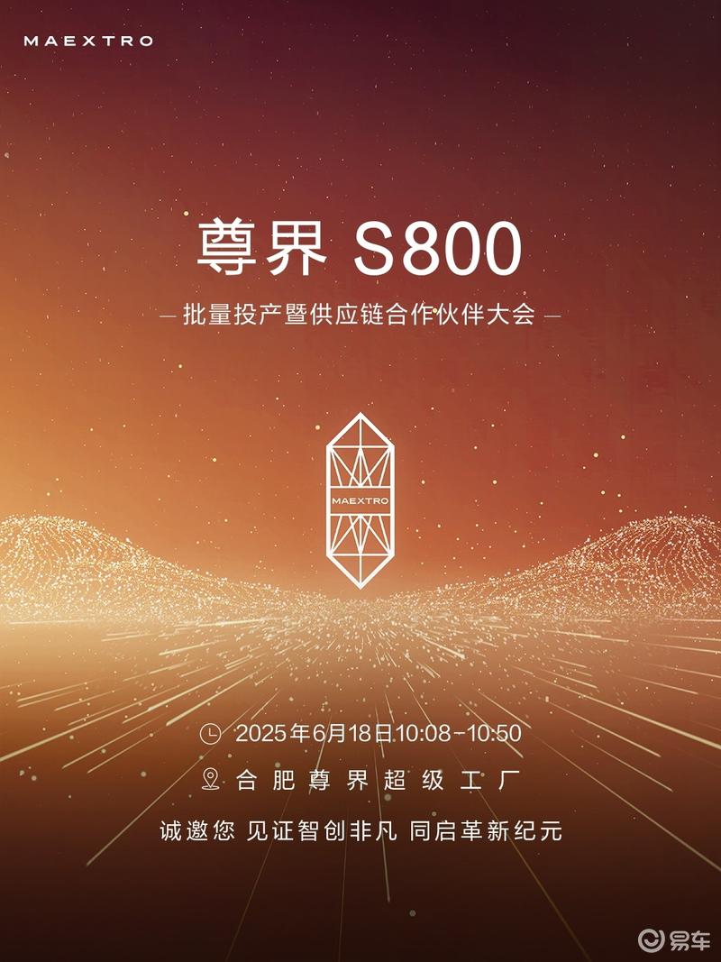 易车讯 6月17日,江汽集团在官微宣布,尊界S800批量投产暨供应链合作伙伴大会将于6月18日在合肥尊界超级工厂举行。尊界S800于5月30日上市,共推出4款车型,售价区间70.8-101.8万元,上市7天大定突破3600台。尊界S800将于6月26日开始交付,8月中旬开始规模批量交付。