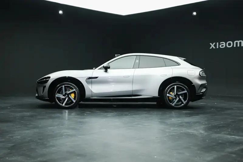 车身侧面,新车和小米SU7一样采用了低风阻设计,无边框外后视镜、五辐式轮圈以及黄色刹车卡钳都与小米SU7一脉相承。值得一提的是,新车采用了电动内翻门把手,拥有10组贯穿式风道,19个风口。