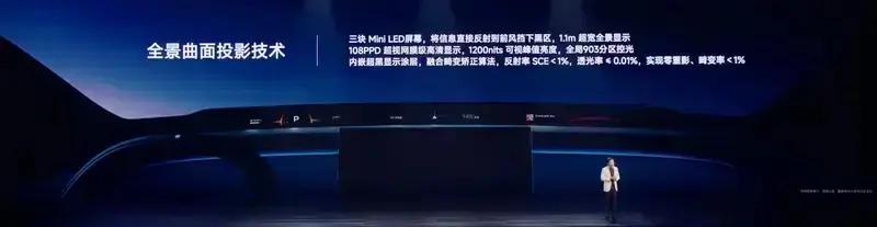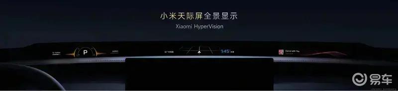 值得一提的是,新车首发搭载小米天际屏全景显示(Xiaomi HyperVision),小米天际屏全景显示不仅突破了传统车内显示器的局限,还为驾驶员提供了一种全新的视觉体验,使得内部空间显得更加科技感十足。此屏幕可以显示续航、速度、多媒体、导航等信息。官方表示,全景曲面投影技术由三块Mini LED屏幕,将信息直接反射到前风挡下黑区,拥有1.1m超宽全景显示。