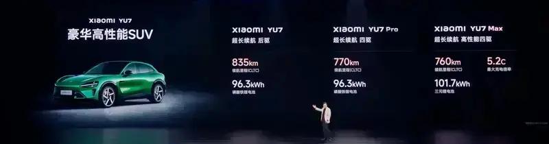 动力方面,新车拥有三种版本,均搭载V6s Plus电机,其中,双电机高性能四驱版最大马力690匹,峰值功率508kW,零百加速3.23秒,最高时速253km/h。续航方面,小米YU7 ( 参数 | 询价 | 图片 ) ( 参数 | 询价 | 图片 ) 标准版搭载96.3度电池包,CLTC续航835km。四驱版车型搭载101.7度电池,CLTC续航770km。高性能四驱版车型同样搭载101.7度电池,CLTC续航里程760km。官方表示,新车15分钟最快补能620km。