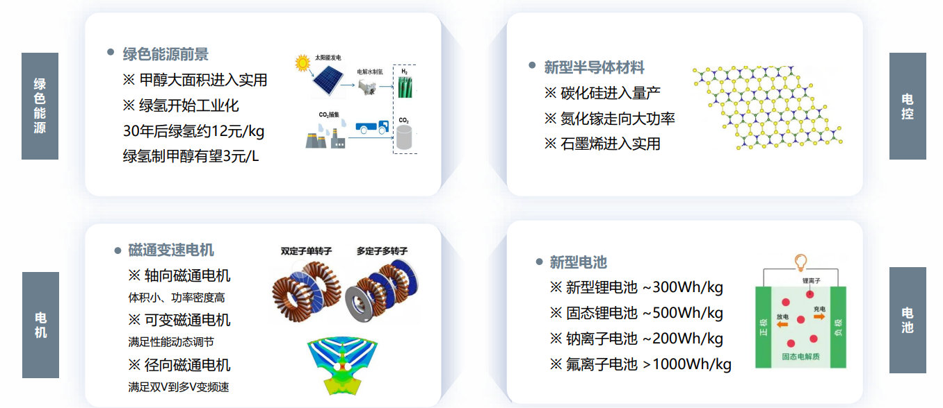 其次,一些颠覆性的技术已经逐步发展成形,将为产业发展开拓更大进步空间。例如,磁通变速电机以及新型半导体材料(碳化硅、氮化镓、石墨烯等)的应用将提升性能;固态、氟离子等新型电池将提高能量密度和安全性;绿色能源方面,绿色甲醇和绿氢将实现工业化应用,预计2030年后绿氢价格可降至12元/公斤,绿氢制甲醇有望达到3元/升,提升经济性。